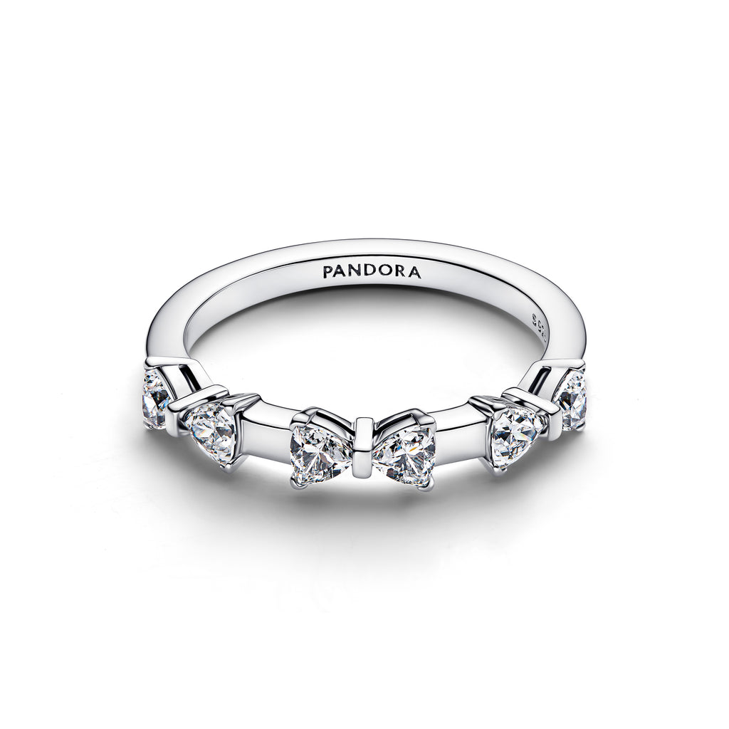Get wrapped up in sparkle. This sterling silver ring features three bows delicately set with stones as a nod to life’s carefully tied moments.