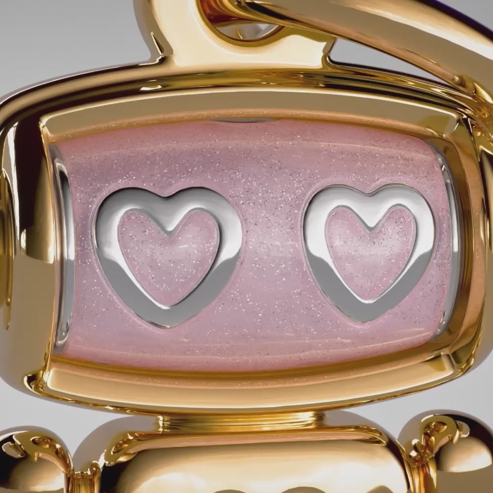 Who says robots don't have feelings? Our sterling silver and 14k gold-plated robot has changeable facial expressions and a shimmering pink enamel heart hand-painted on their chest.