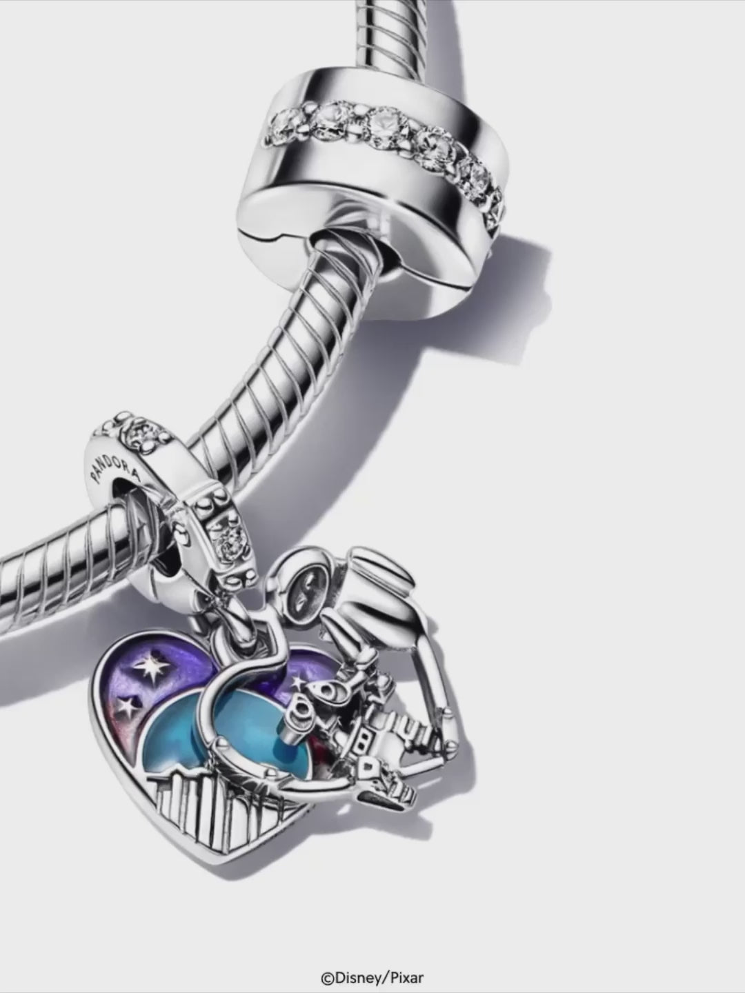 Celebrate an out-of-this-world love with our Disney Pixar Wall-E & Eve Glow-in-the-dark Dangle Charm. This sterling silver charm features kind-hearted Wall-E giving Eve a precious plant on a cut-out heart dangle. A second flat heart dangle is engraved with the message "LOVE YOU MORE THAN WORDS CAN SAY" and lights up their world with a glow-in-the-dark blue enamel moon. Add this charm to your collection, or gift it to the one you'd go to the moon and back for.