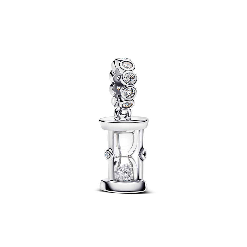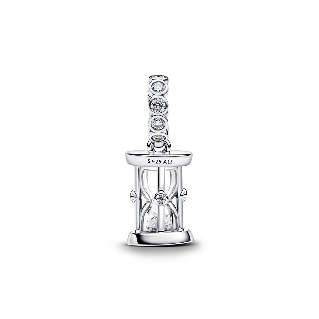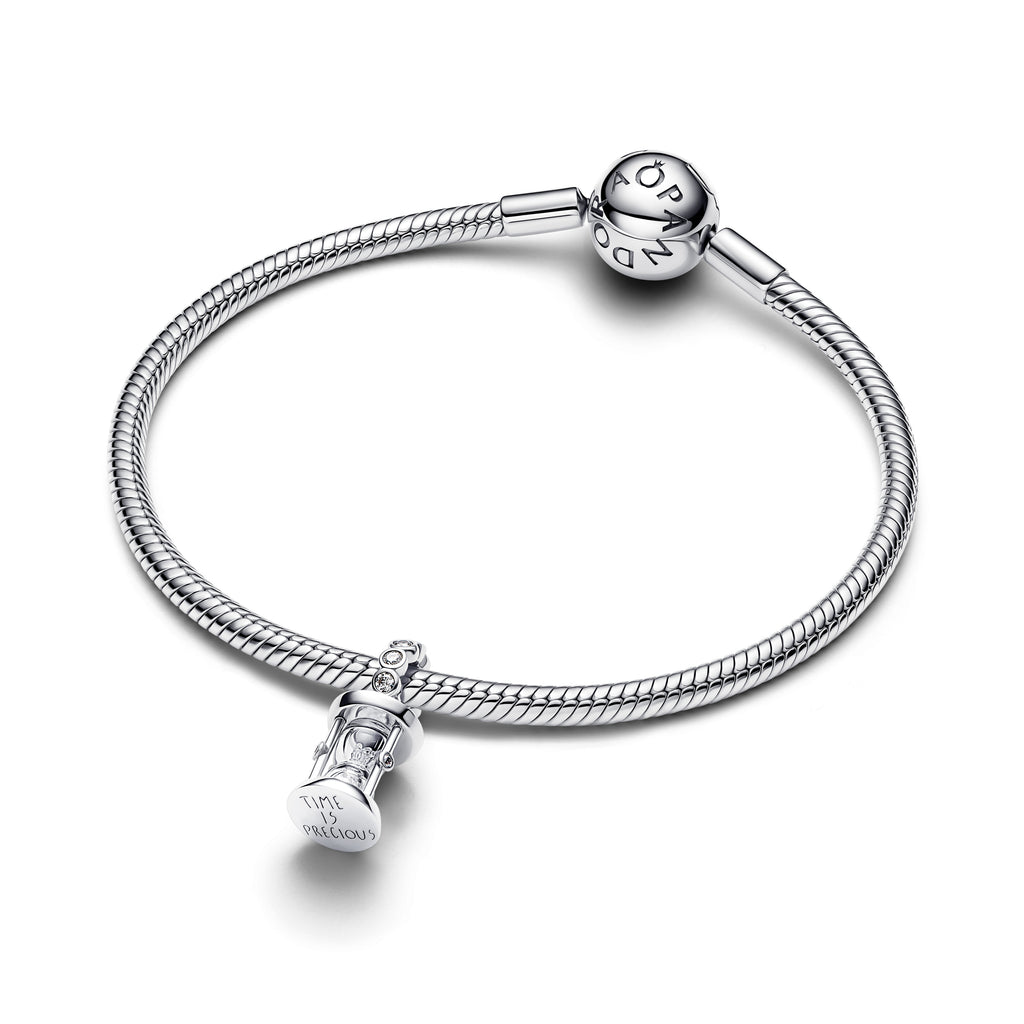 Time never stands still. This sterling silver Hourglass Dangle Charm features sparkling cubic zirconia, moveable stones inside and the engraving 'TIME IS PRECIOUS'. Wear it as a reminder to treasure every moment.