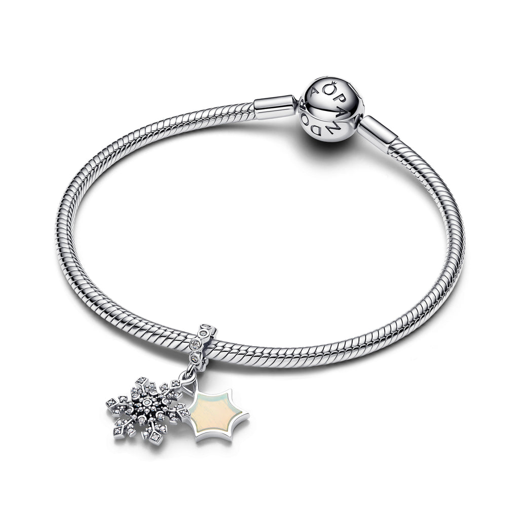 Channel winter wonder in sterling silver. This charm pairs a sparkling snowflake with a shimmering star featuring aurora lab-grown opal resin on one side and the engraving ‘I MELT FOR YOU’ on the other.
